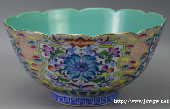 此藏品口微撇,圈足,内以松石绿,外壁粉彩描金描绘五福捧寿图案,外围间饰粉彩缠枝花纹并盘长节,画工细致,华丽富贵,全器色彩鲜艶华贵,绘工精细,装饰效果浓烈。为宫廷御制用品,存世量非常稀少,具有非常好的收藏价值,值得珍藏! 联系我时,请说是在季晨网看到的,谢谢!